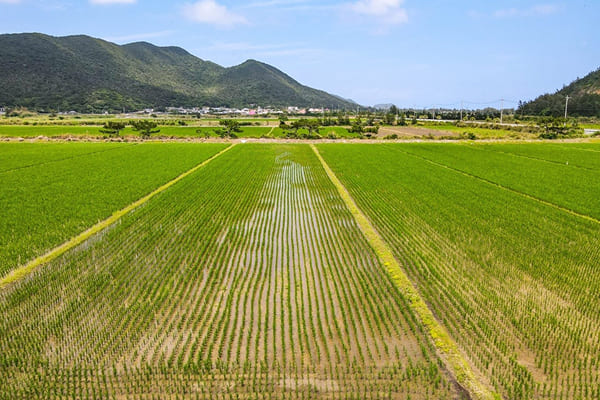 麓に広がる田畑と、人々が寄り添い暮らす集落。
