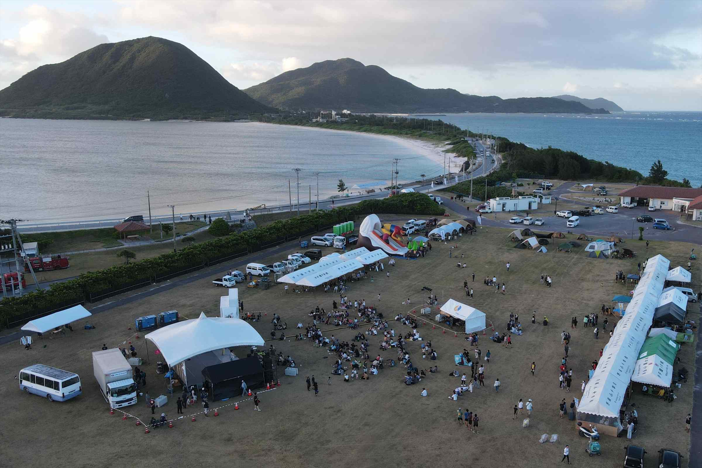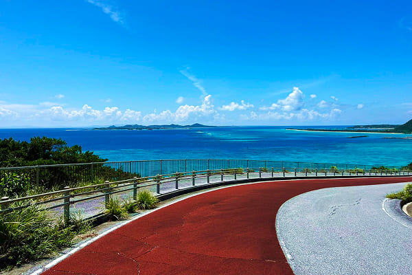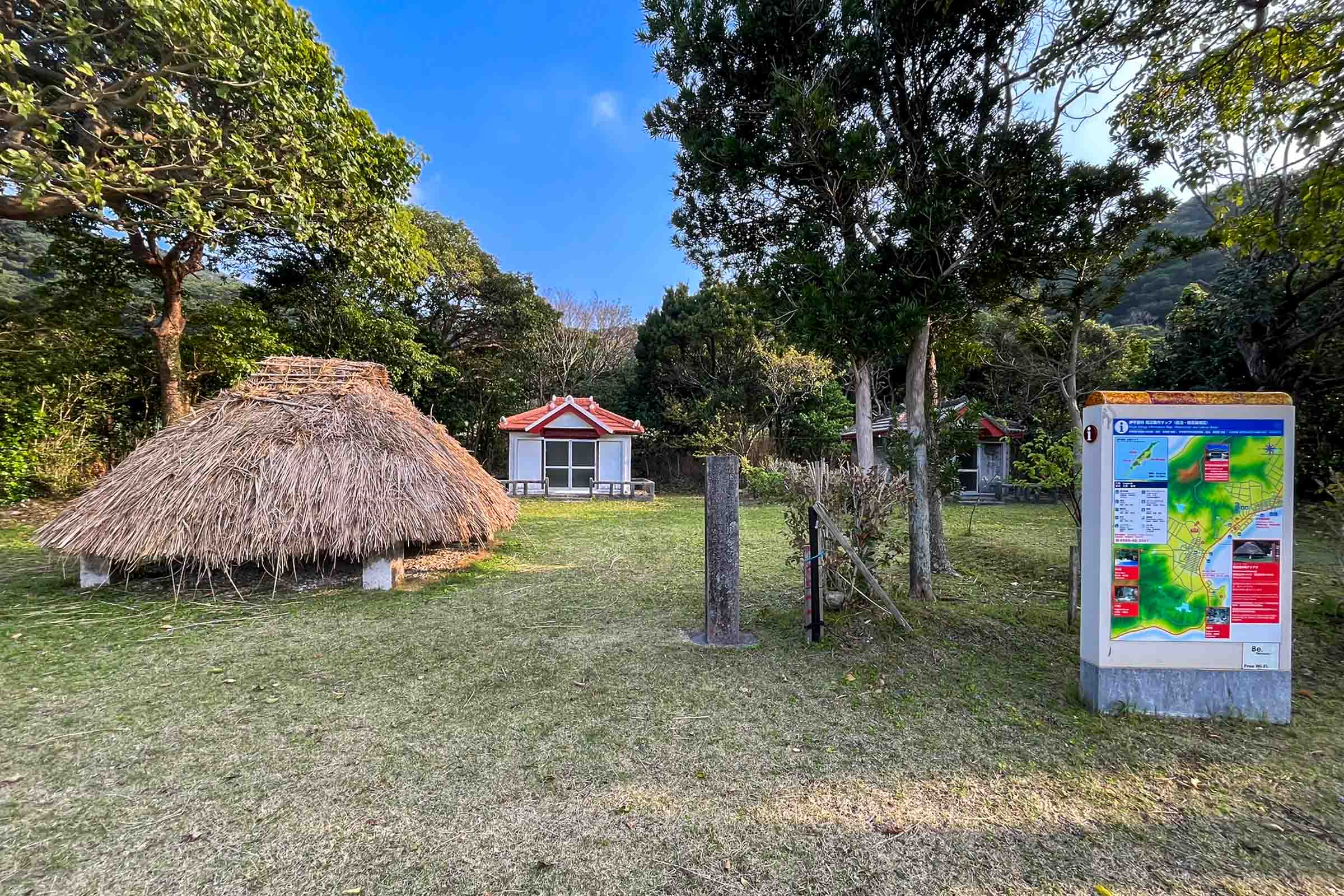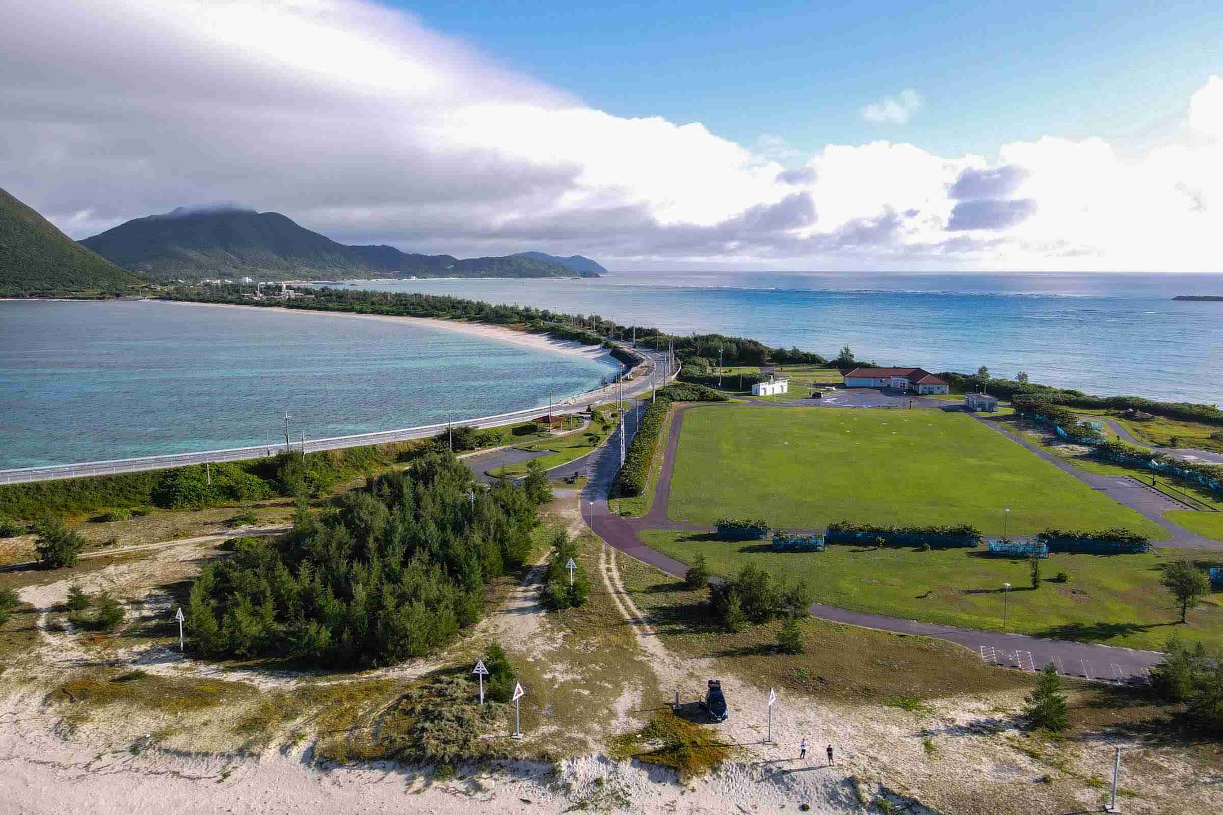 伊平屋島の南端、本島と野甫島を結ぶ野甫大橋のたもとの砂嘴にある、芝生に覆われた広...