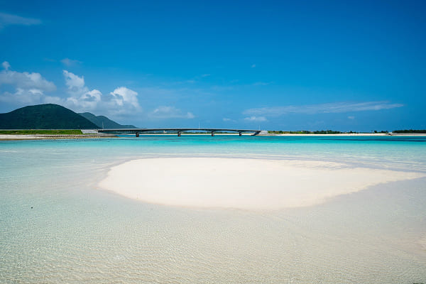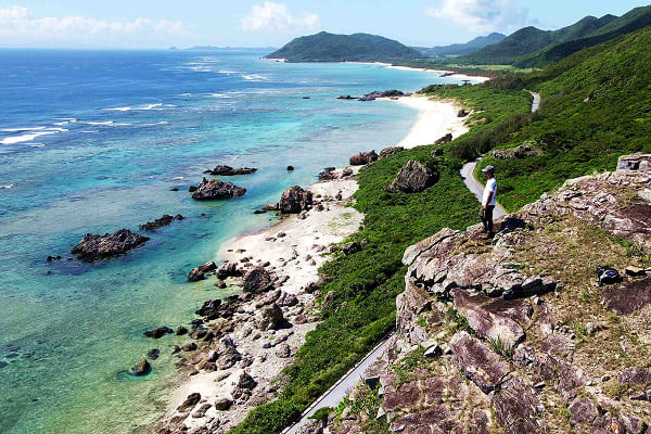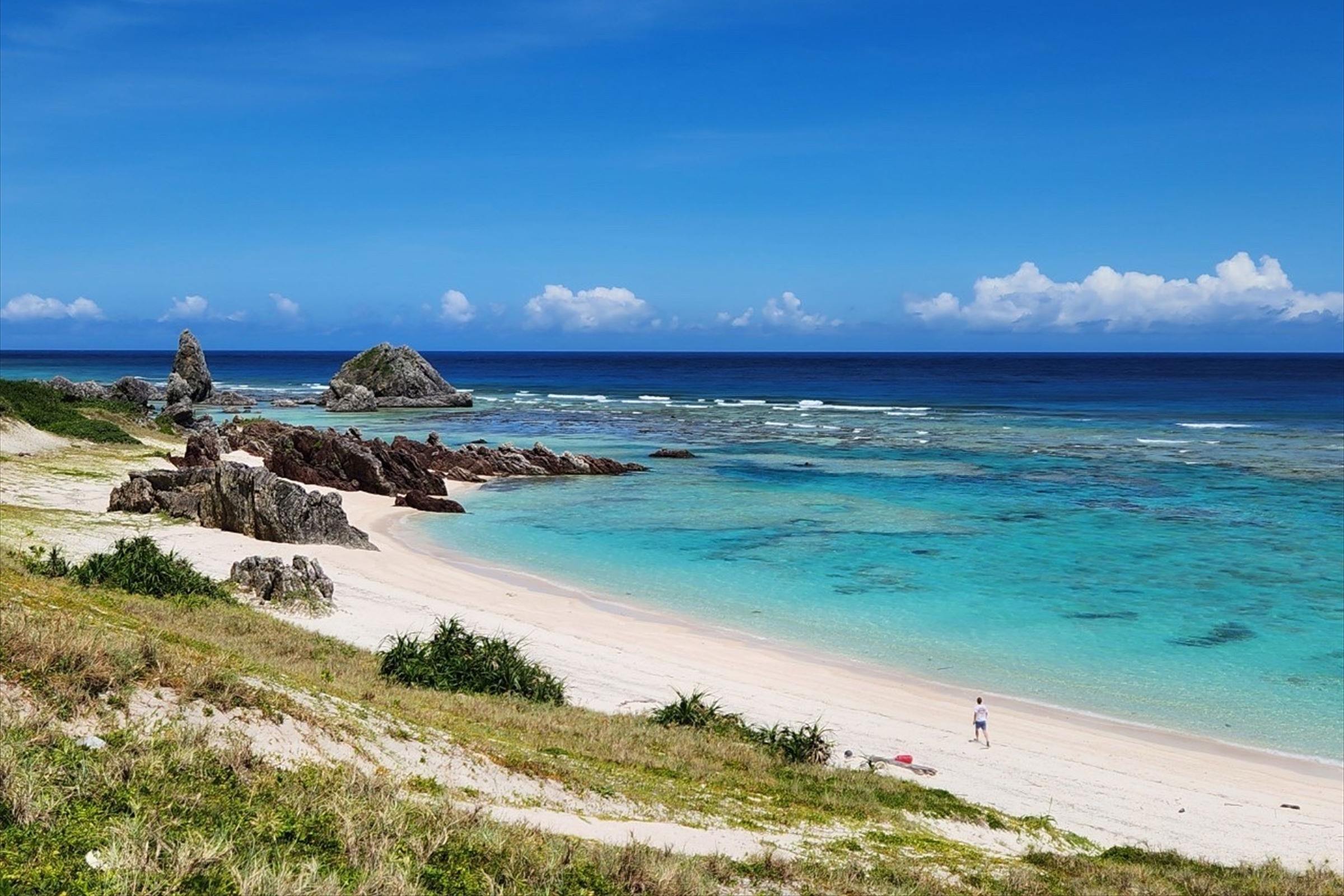 あざやかな青い海と真っ白な砂浜、緑豊かな山並み、