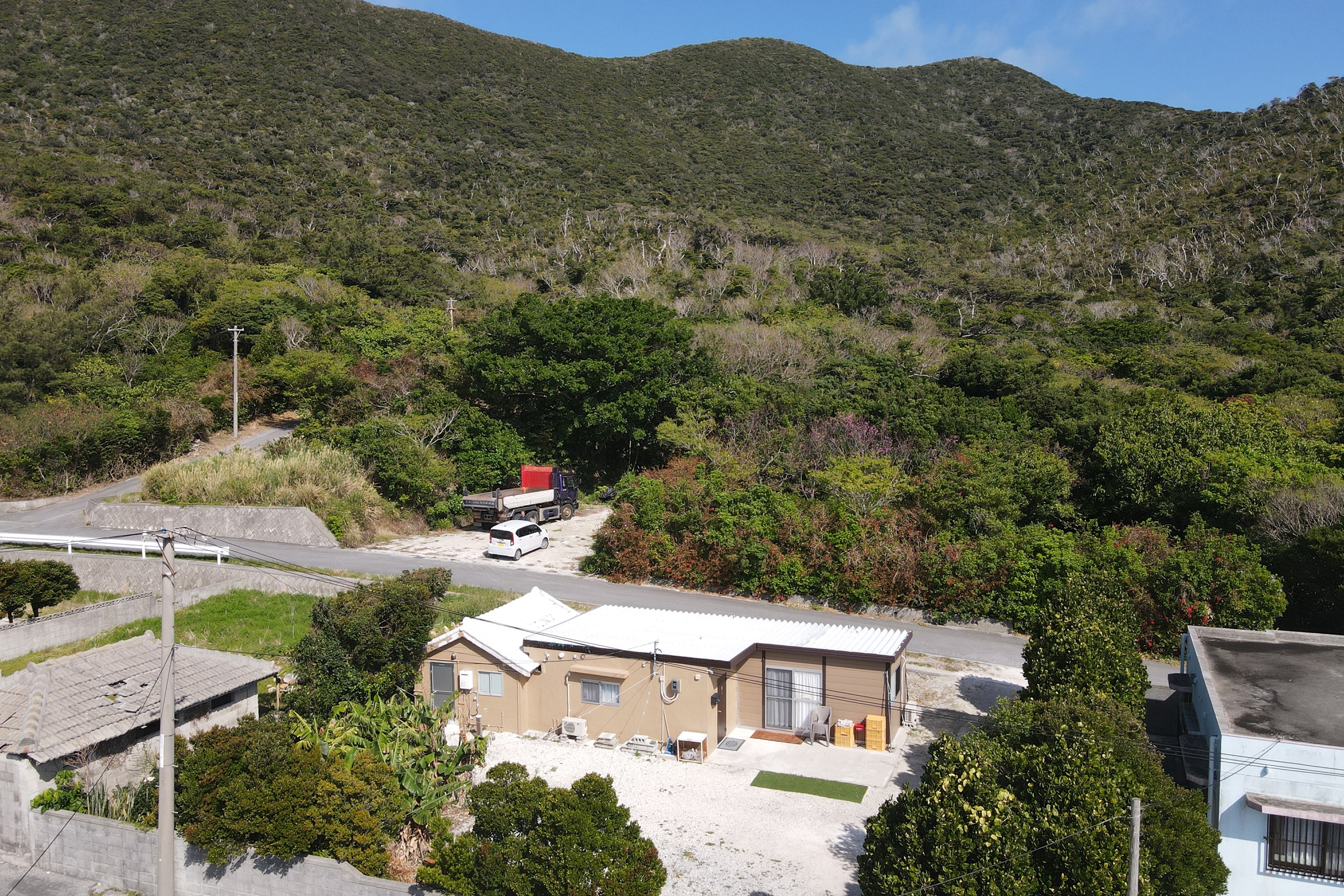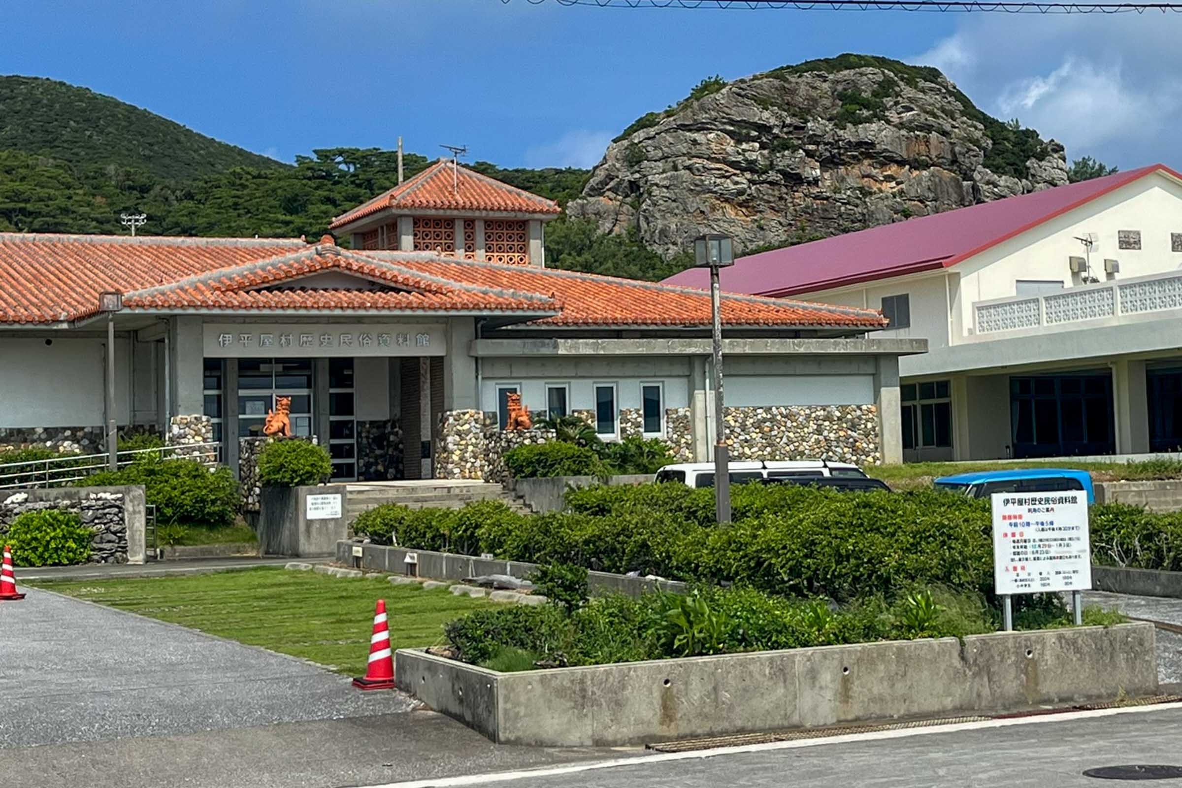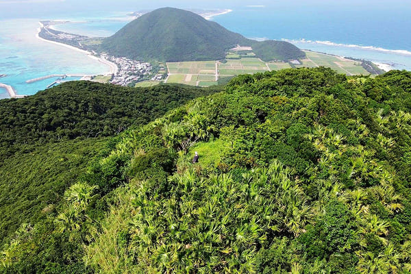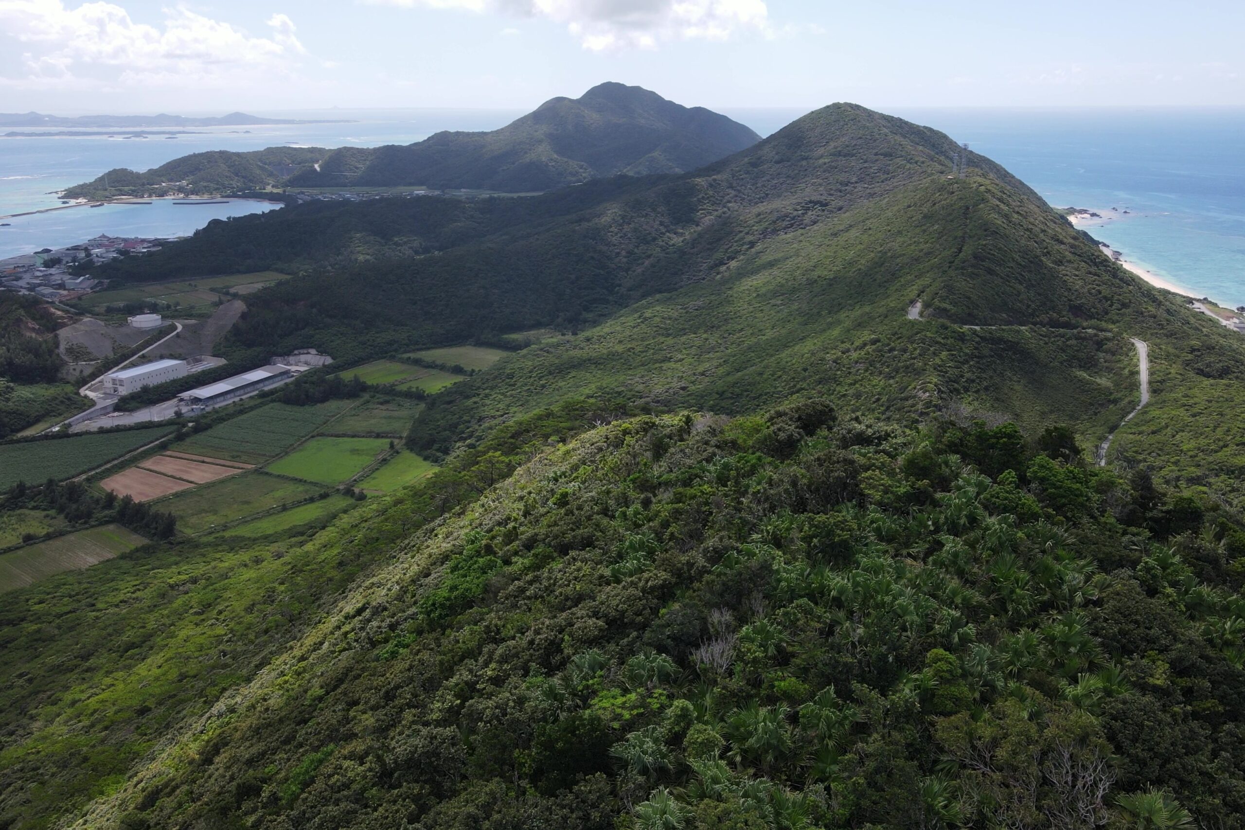 ポッコリ特徴的な阿波岳と賀陽山の間の海岸線沿いに佇む島尻集落。伊平屋漁港や水揚げ...