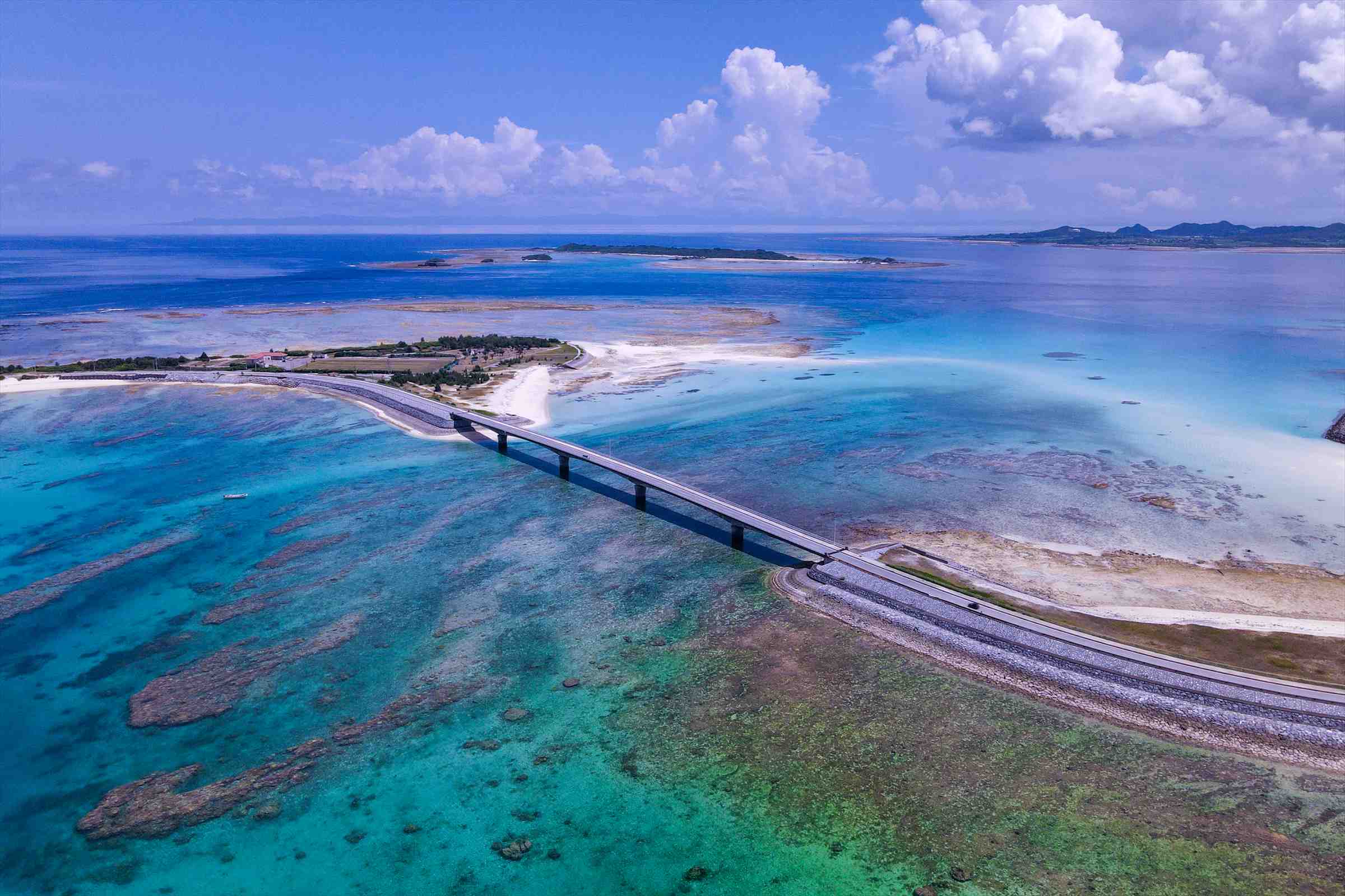 伊平屋本島と野甫島を結ぶ橋梁。橋の上から南側は伊是名島、具志川島、遠くに伊江島、...