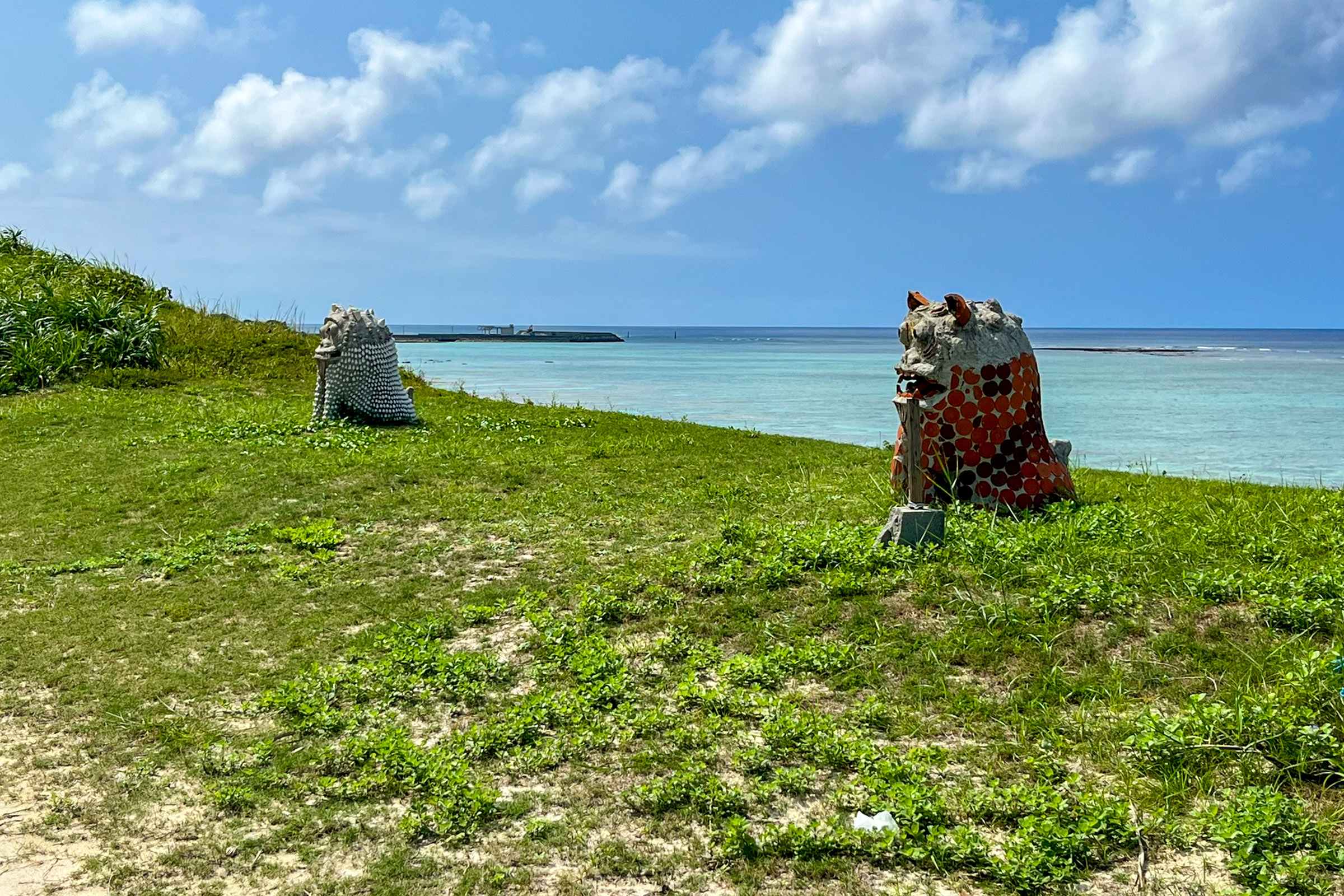 西の海岸線道路の路肩に海をバックにシーサーが2匹並んで立っています。向かって右、...