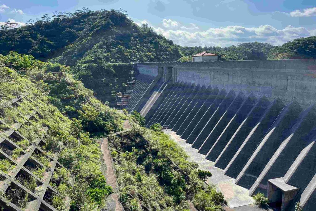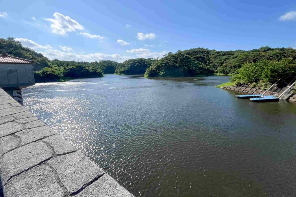 2004年に竣工した我喜屋ダムのサイト上に続く坂道となる。途中我喜屋集落を一望できるポイントを過ぎ、ダムサイトの上に出る。