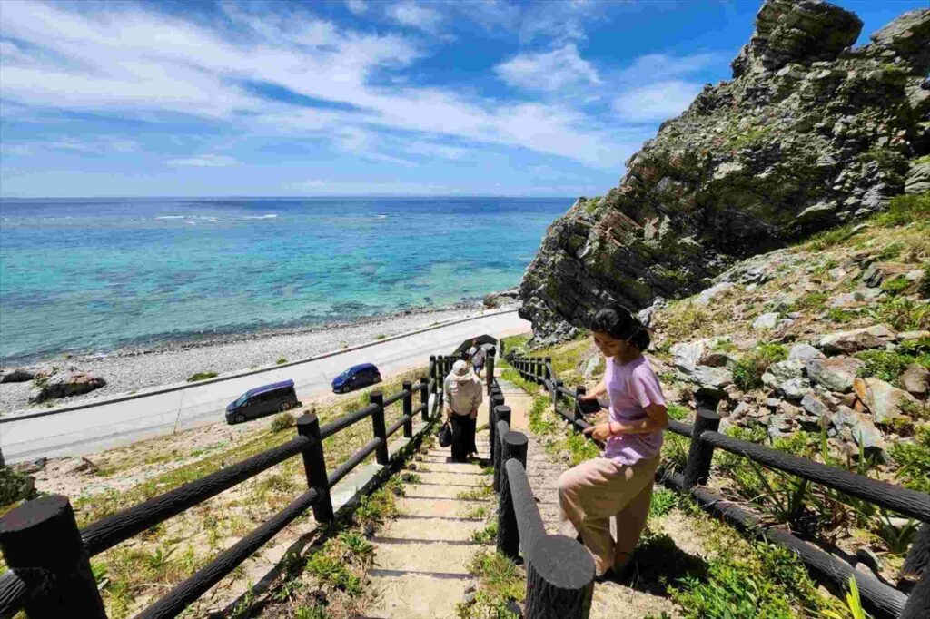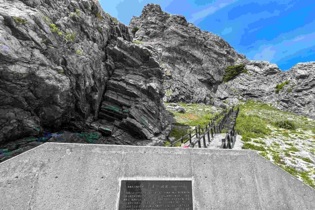 海岸から中腹まで階段が伸びているものの、洞窟の入り口は認められず、階段を上がりきると、