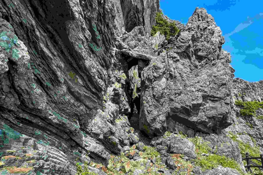 遠い田名集落付近からでも目立つ、断崖絶壁の岩山、麓まで近づくとその大きさに驚かされます。