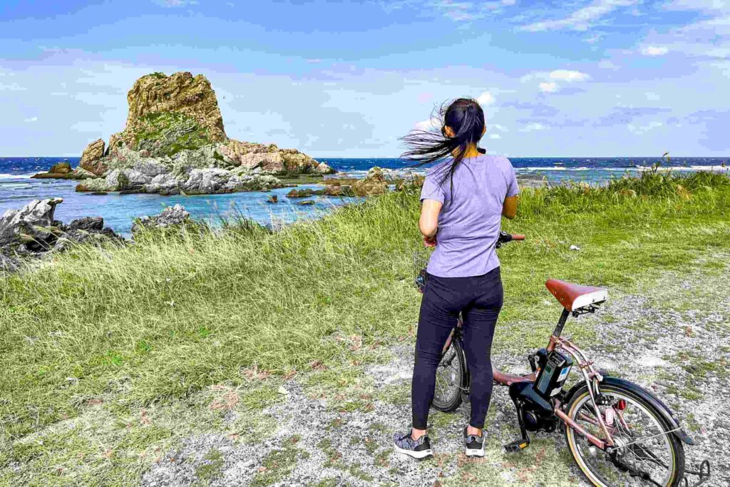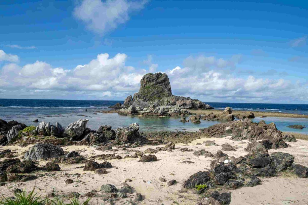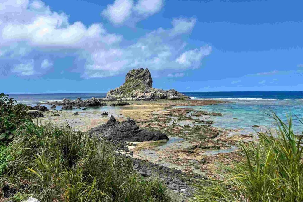 海面から親指のように突き出た巨岩がヤヘー岩です。潮が引いているときに近づいてみると、陸とつながっていることがわかります。